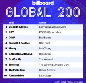 이것은 미국 차트이지만 글로벌 성격을 띠고 있습니다: Global 200은 200개 이상의 지역 데이터를 반영합니다. – Global Excl. US — 마찬가지로, 미국을 제외한 글로벌 차트입니다. 이를 통해 미국 외 지역에서의 인기를 확인할 수 있습니다. – 예를 들어: 2025년 아티스트 Bruno Mars(다른 아티스트들과 공동)는 차트 1위 자리를 가장 오래 유지했습니다. 이 차트들은 현대 글로벌 음악 시장을 이해하는 데 핵심적인 지표입니다.